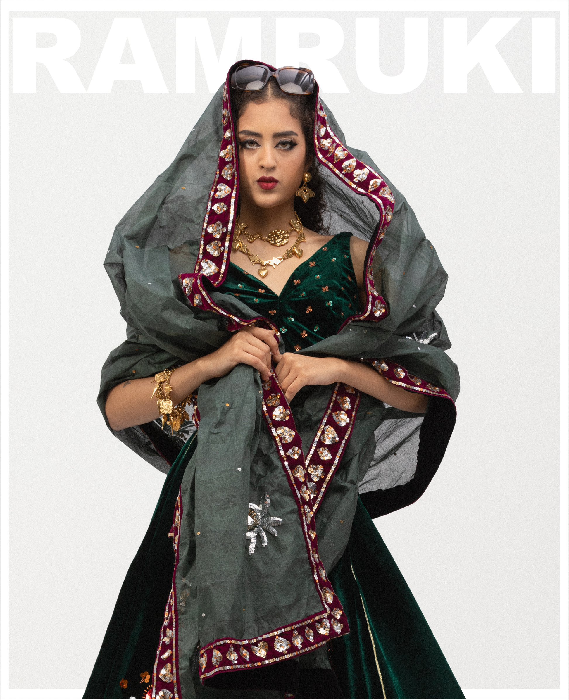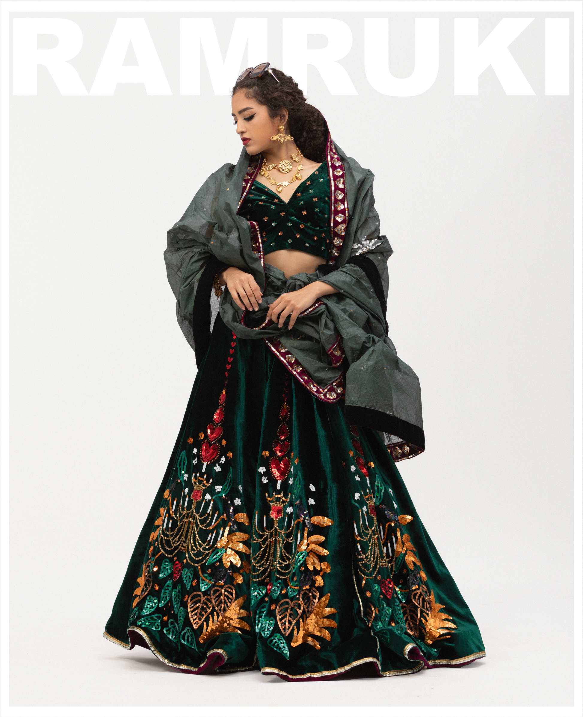 Lehenga Set : Velvet Lehenga, Velvet Blouse, Organdy Dupatta.