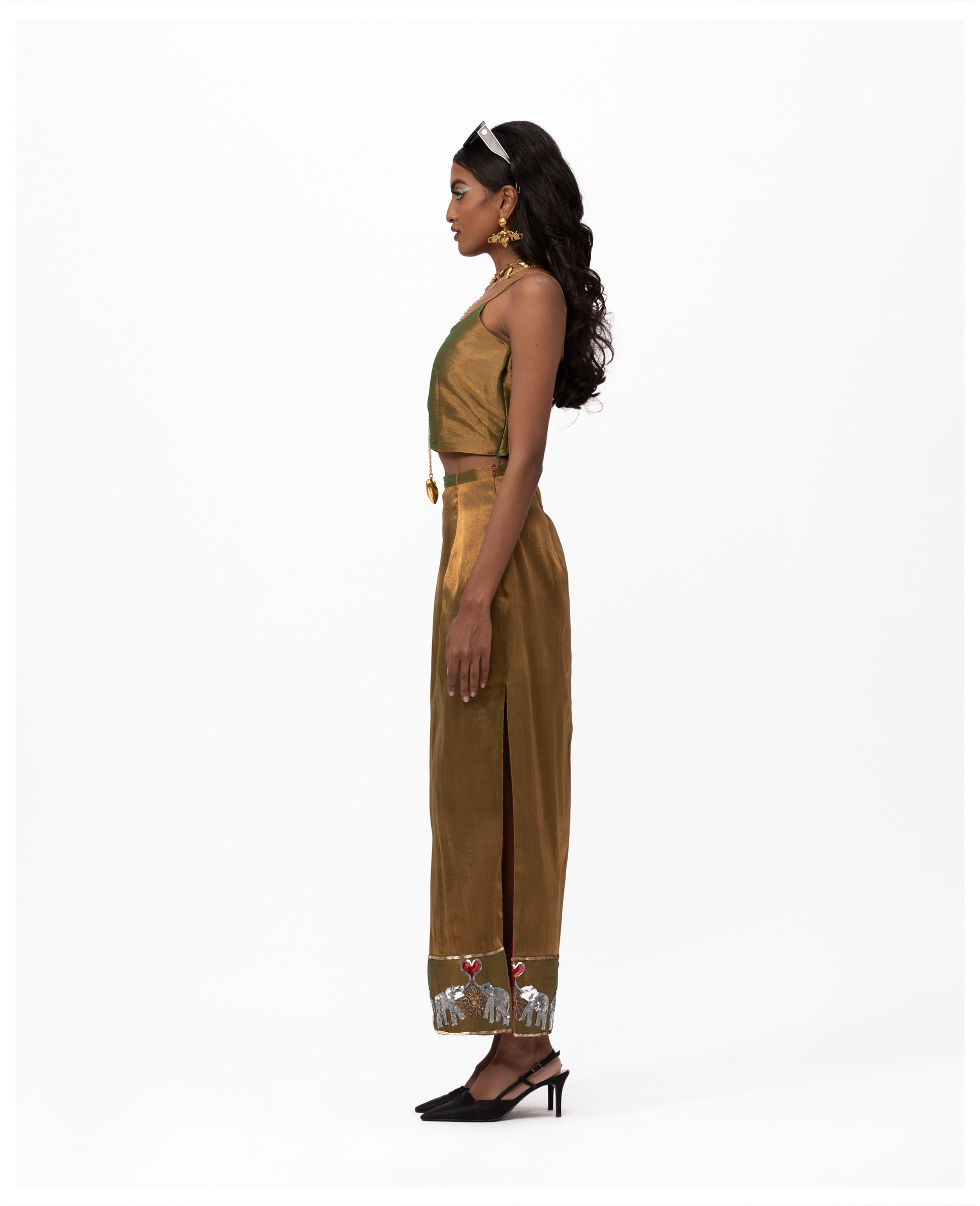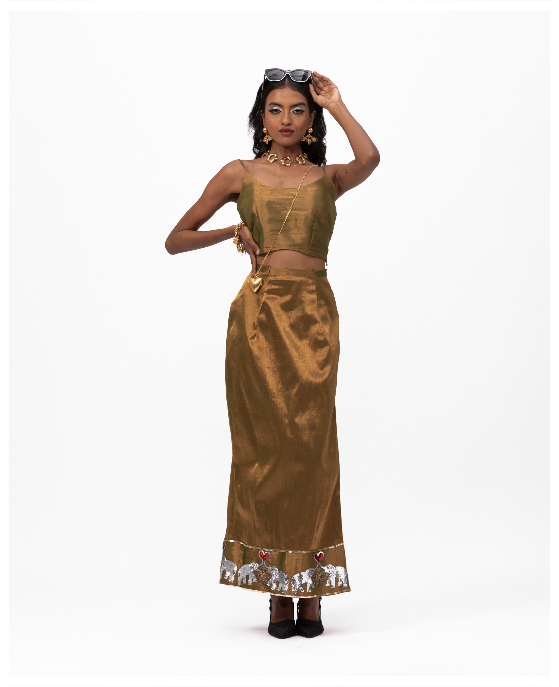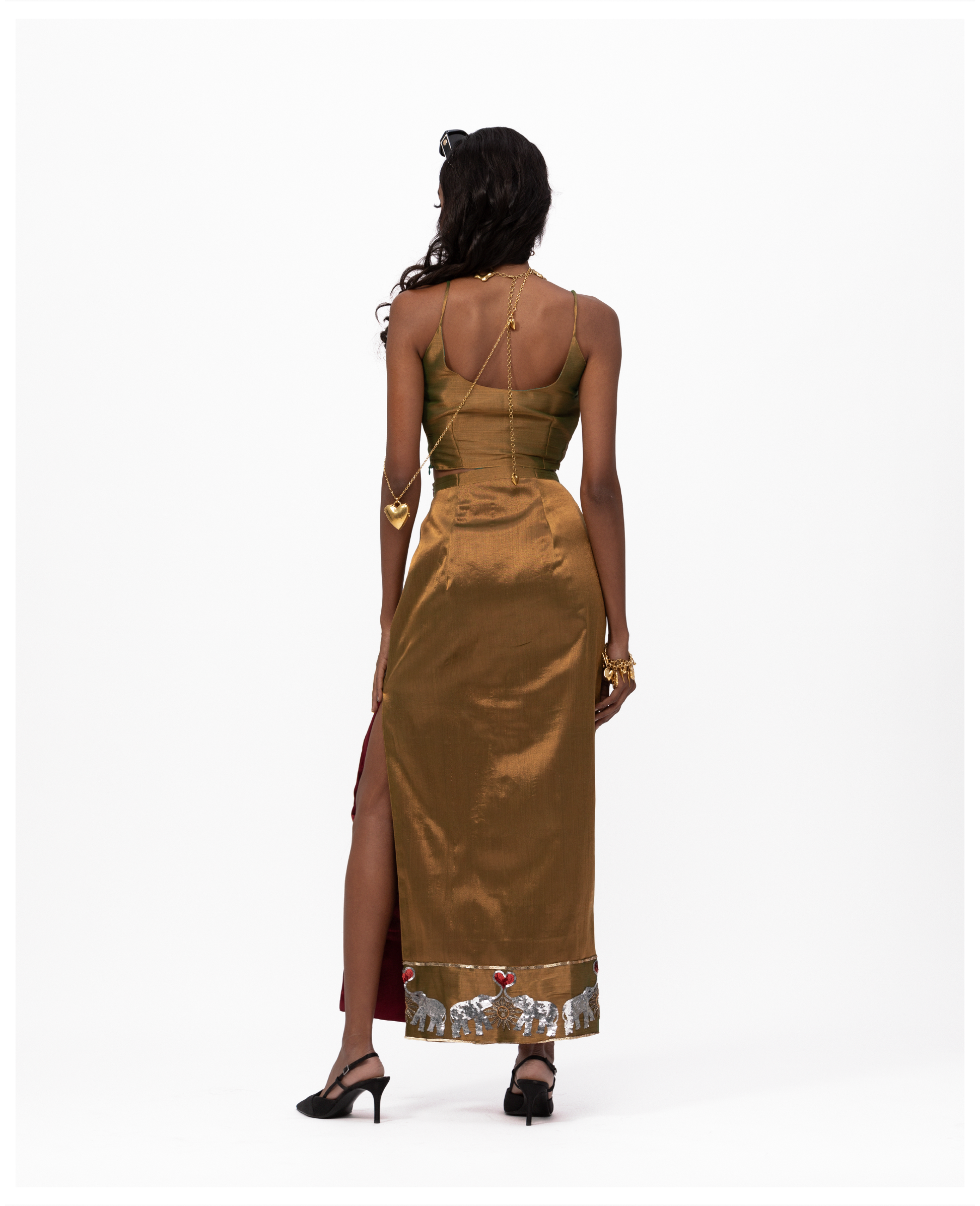 Elephants Showering in the Golden Sun Skirt and Parachute Top by Ramruki, made using Gold Tissue, and lined with Satin designed just for you with loads of love, and sunshine.