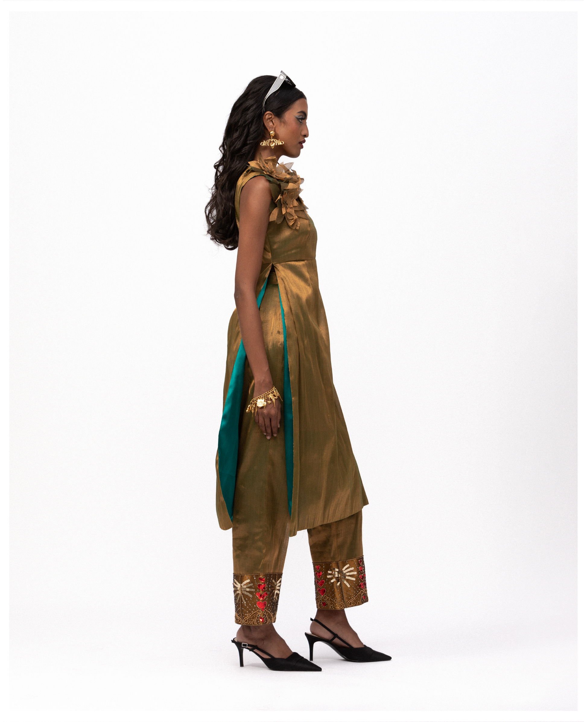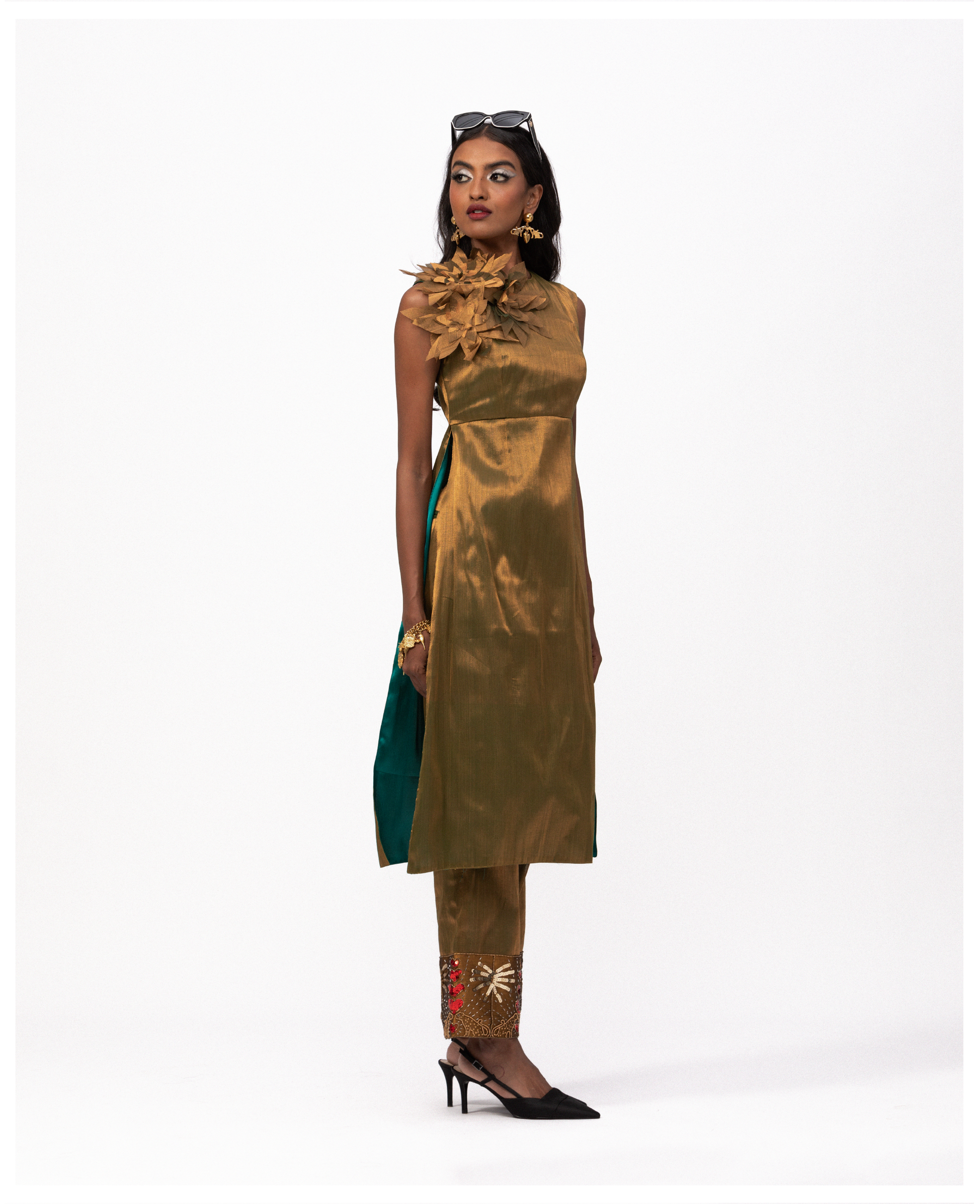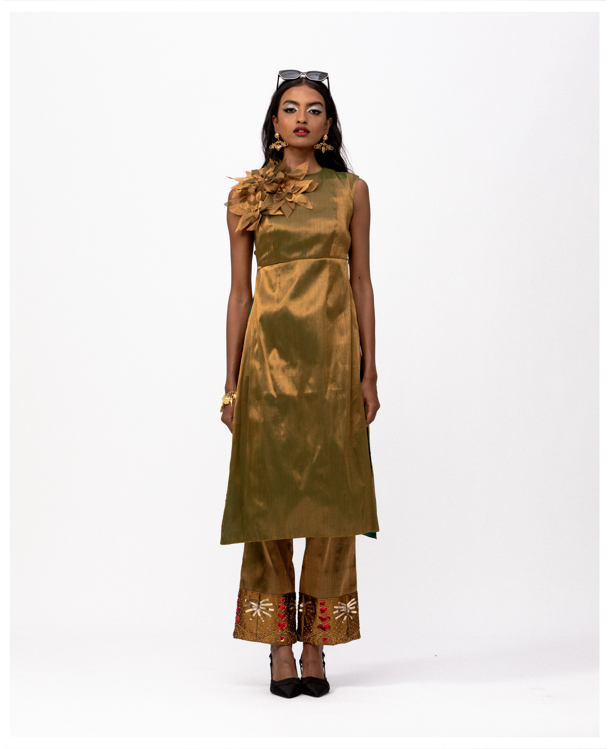 Sunflower Kurta & Pant Set by Ramruki, made using Gold Tissue, and lined with Satin designed just for you with loads of love, and sunshine.
