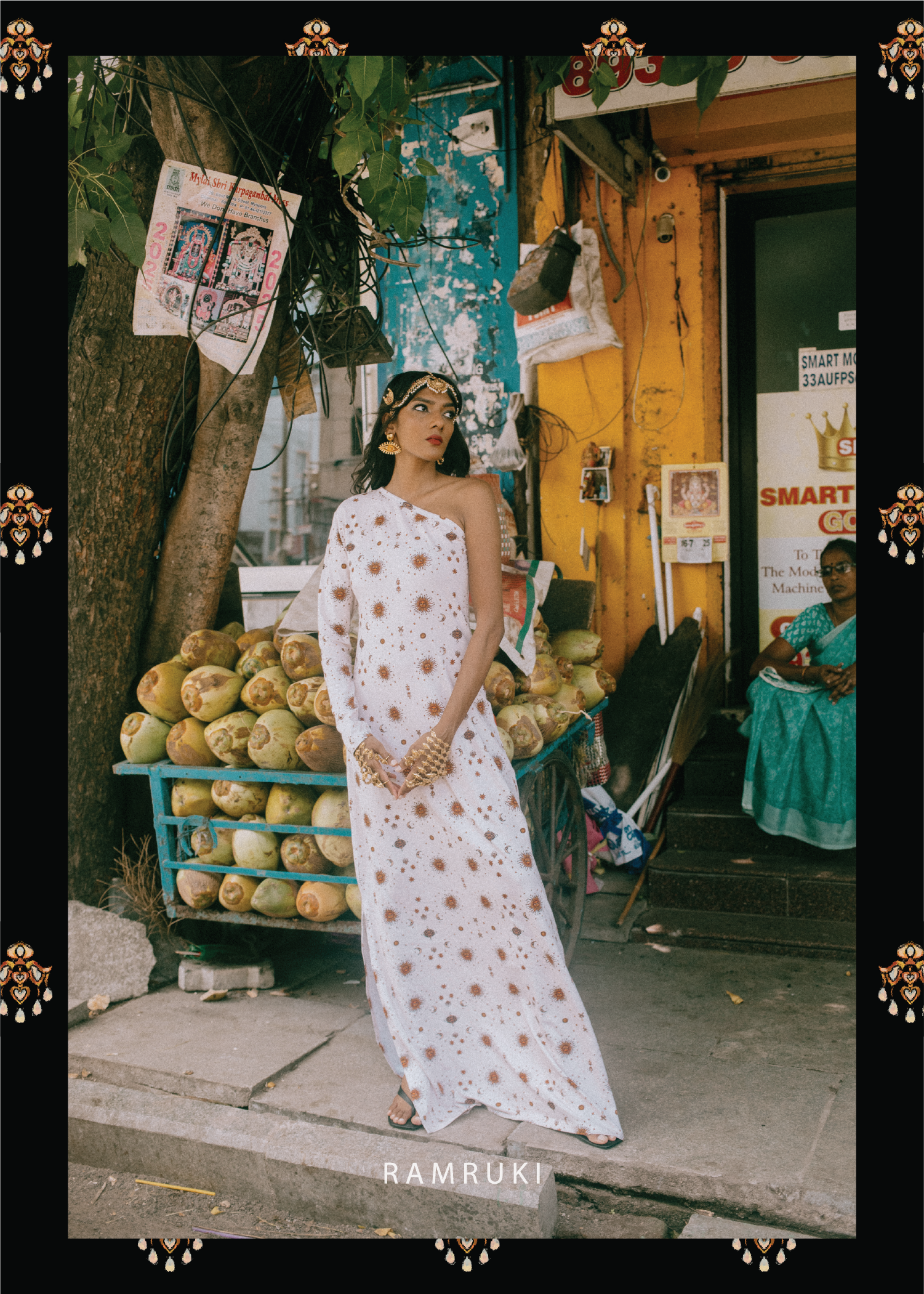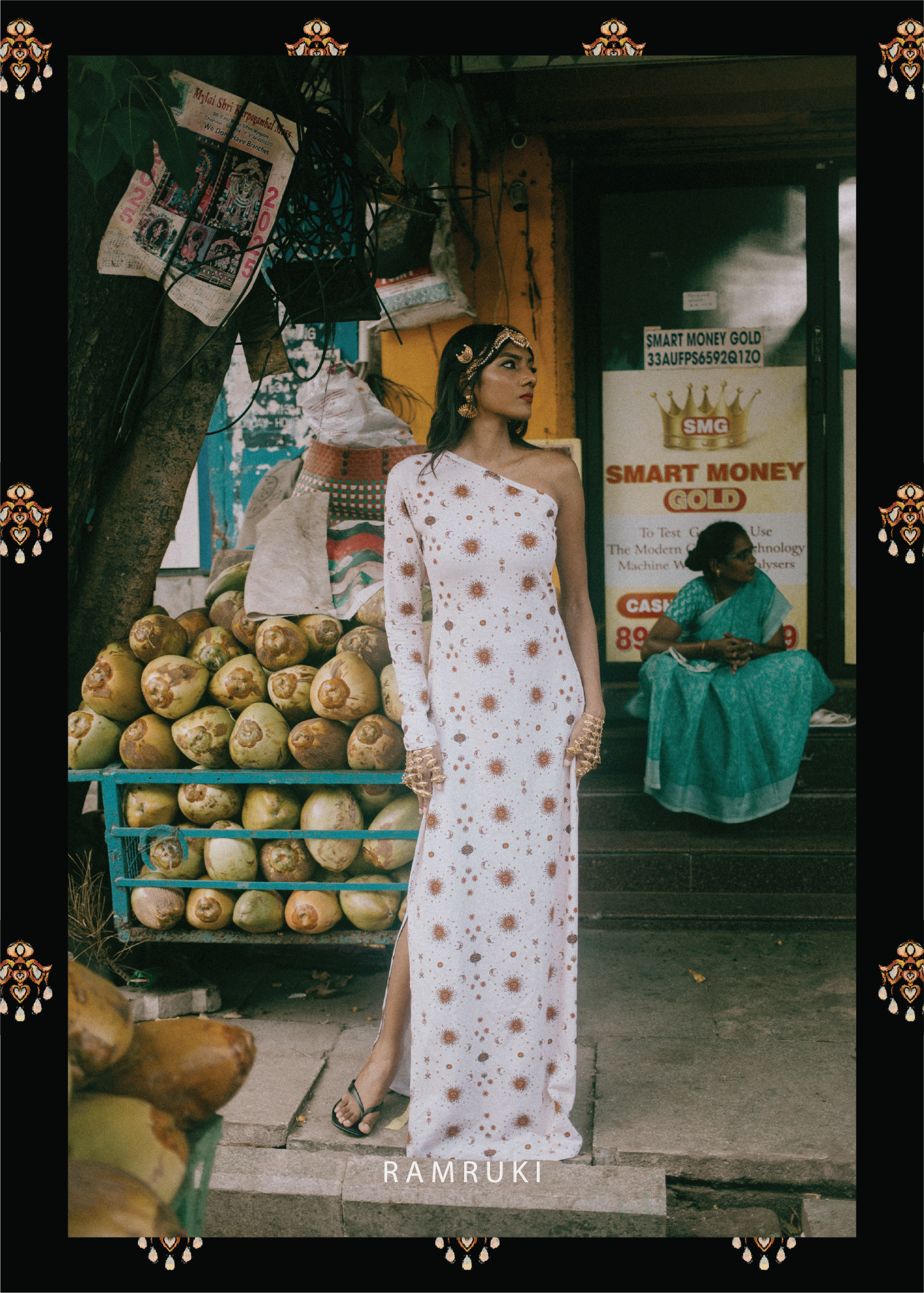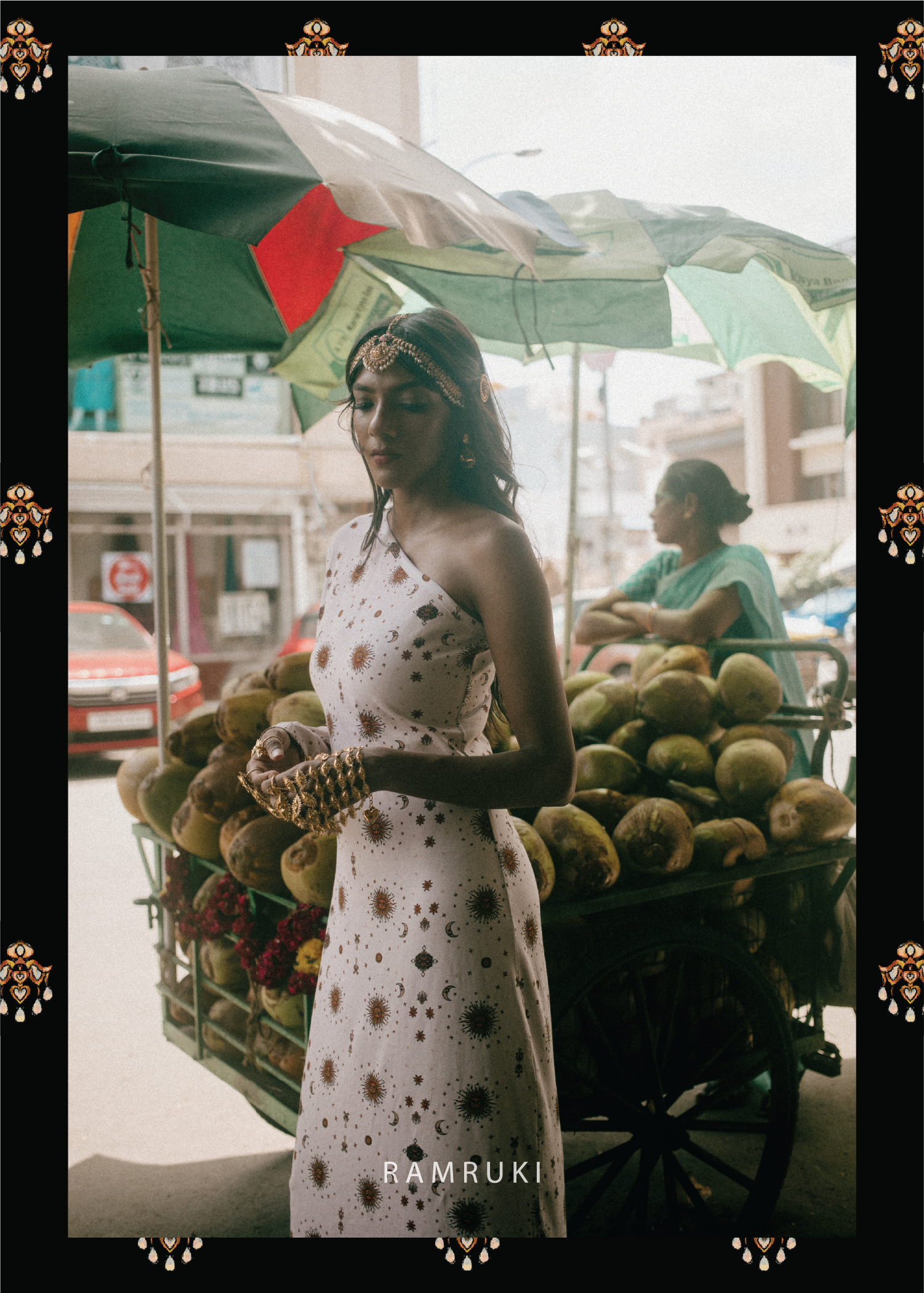 This collection takes the mookuthi — delicate, iconic, full of memory — and reimagines it as bold prints on modern silhouettes. Think global dresses, statement tops, and striking cuts that turn tradition into something entirely fresh.