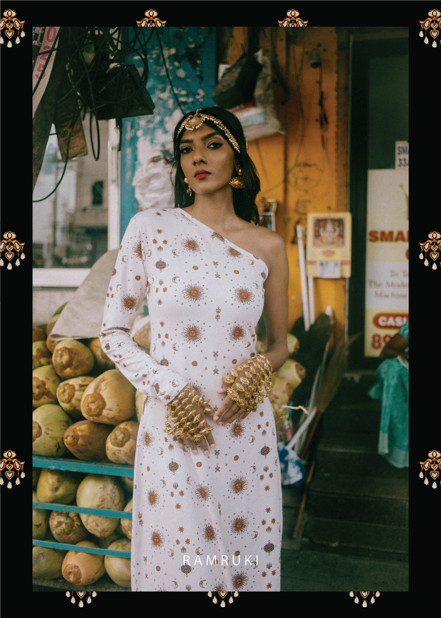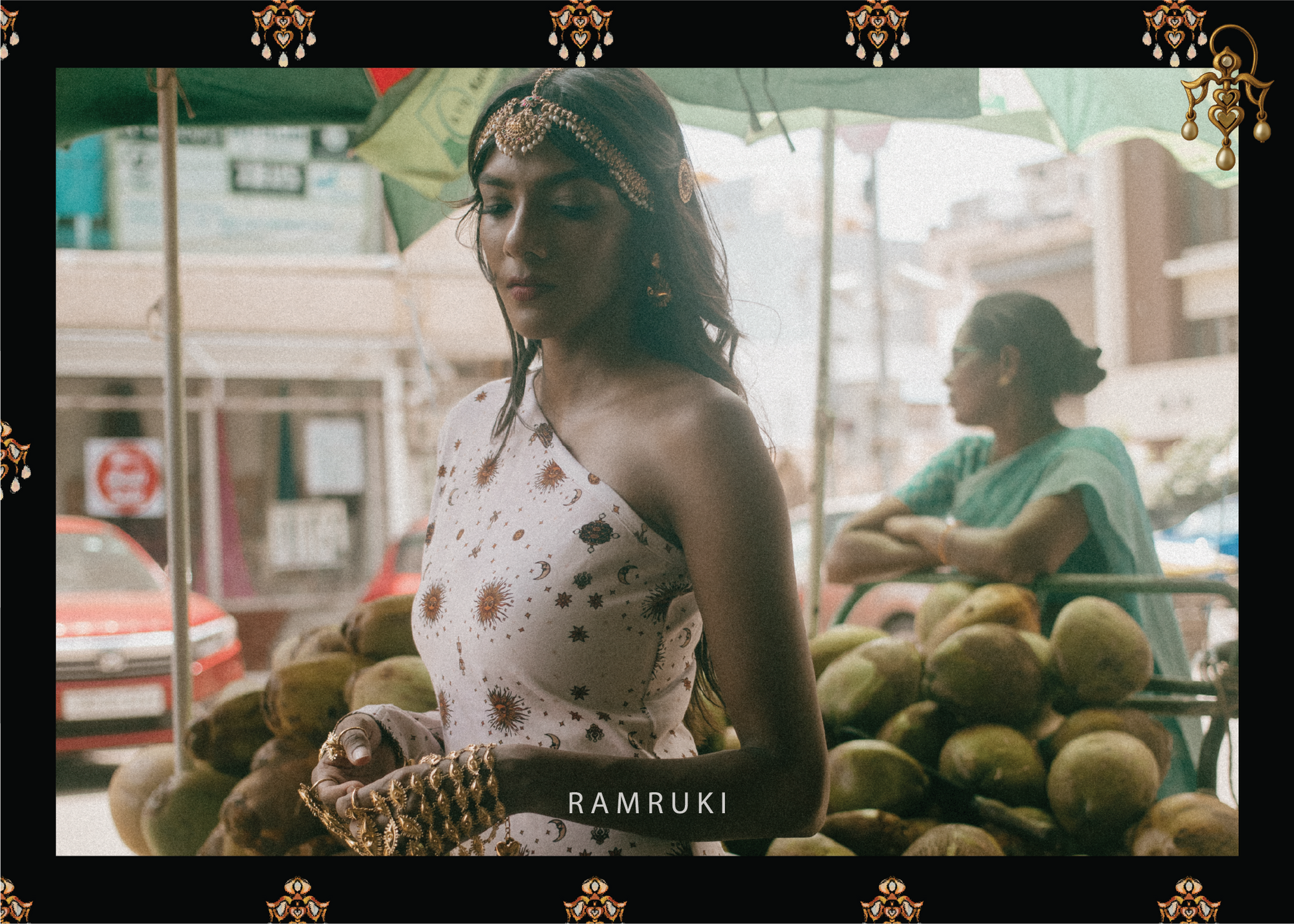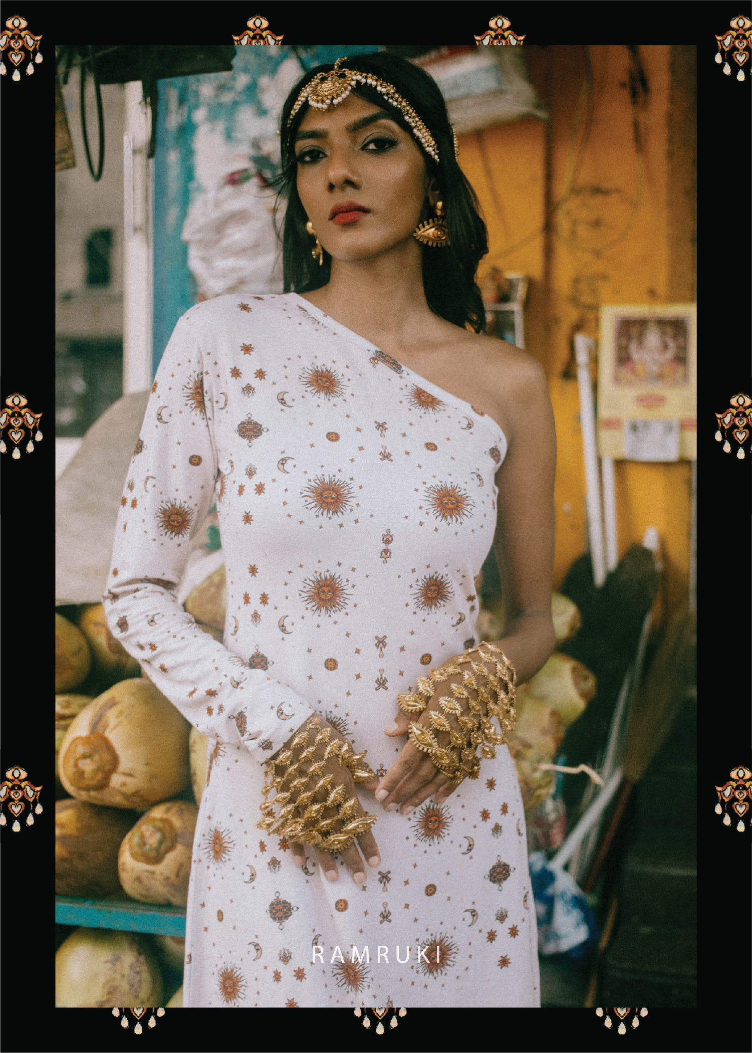 This collection takes the mookuthi — delicate, iconic, full of memory — and reimagines it as bold prints on modern silhouettes. Think global dresses, statement tops, and striking cuts that turn tradition into something entirely fresh.